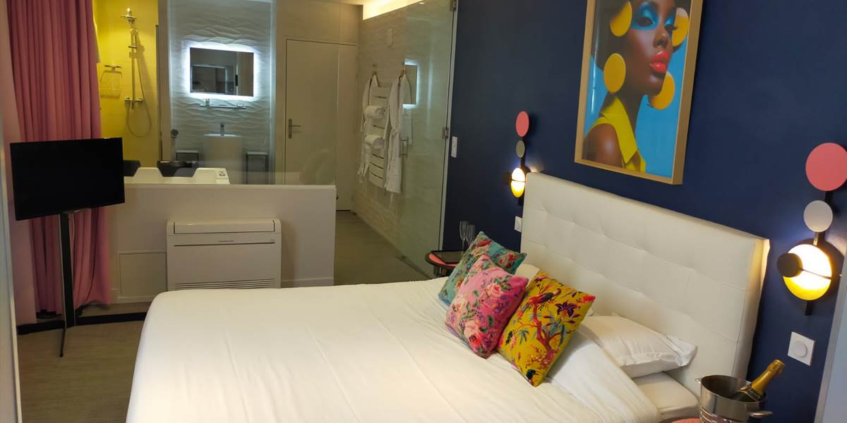 We offer you and apartment with its private double balneotherapy. Comfortable terry clothes, essential oils and flowers will make a magical moment. It's the perfect compromise between an anti-stress evening, a hyper-center ballade and a romantic dinner in one of the numerous restaurant. This option is perfect for you? Have a romantic and relaxing moment in a unique place with an ""Eyes Wide Chut"" decoration.